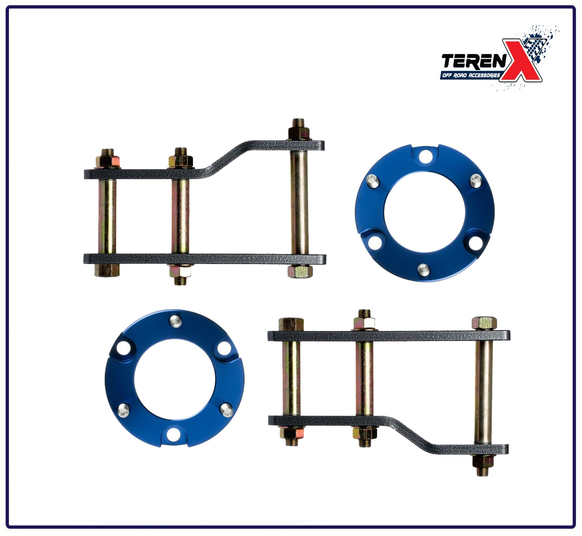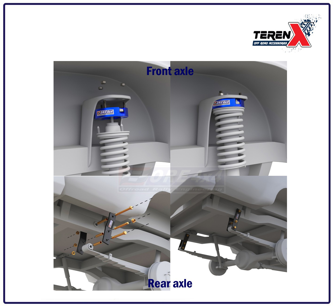 - Pachet complet, montaj direct: Setul include toate componentele necesare pentru o înălțare completă față și spate: distanțiere pentru coloanele față și suporți prelungiți pentru arcurile lamelare (resorturi) din spate.