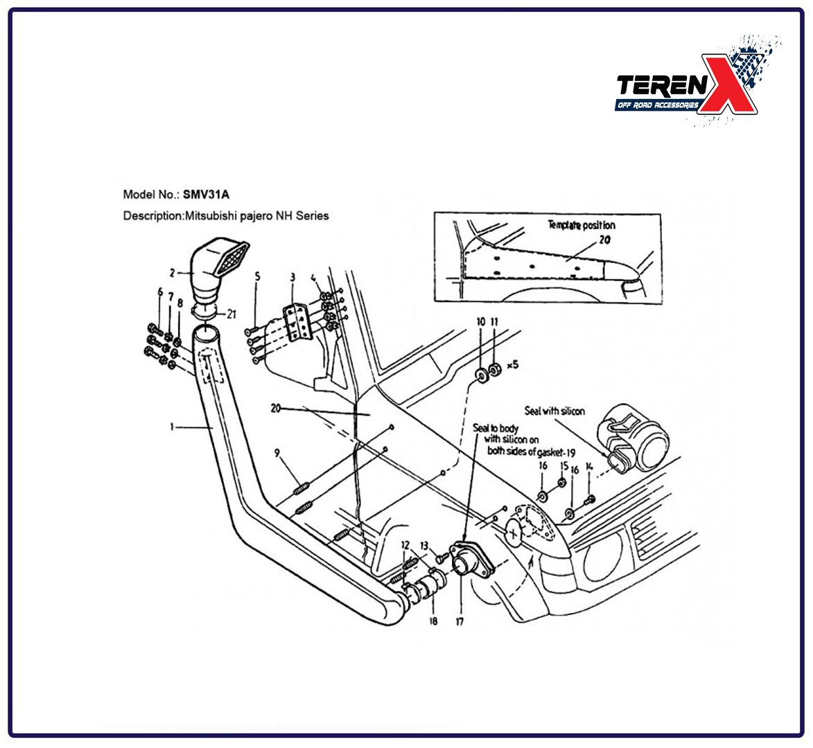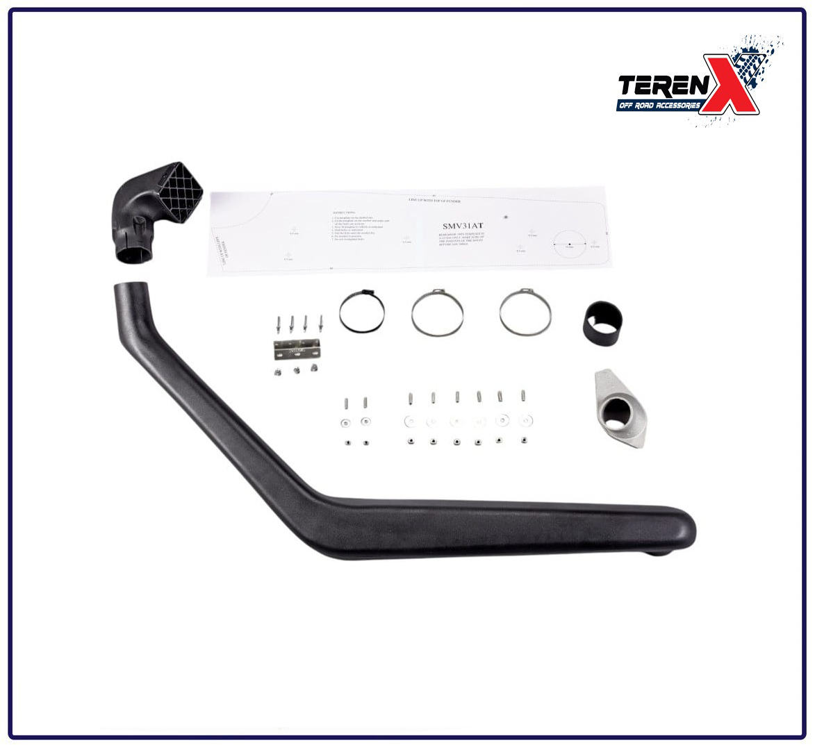 Snorkelul dedicat pentru Mitsubishi Pajero I/II (V31/V32), anii 1990 - 1997, este conceput pentru a asigura funcționarea optimă a motorului în condiții extreme. Principalul scop este de a muta priza de aer la înălțimea plafonului, permițând vehiculului să traverseze vaduri adânci și, în același timp, să alimenteze motorul cu aer mai curat.